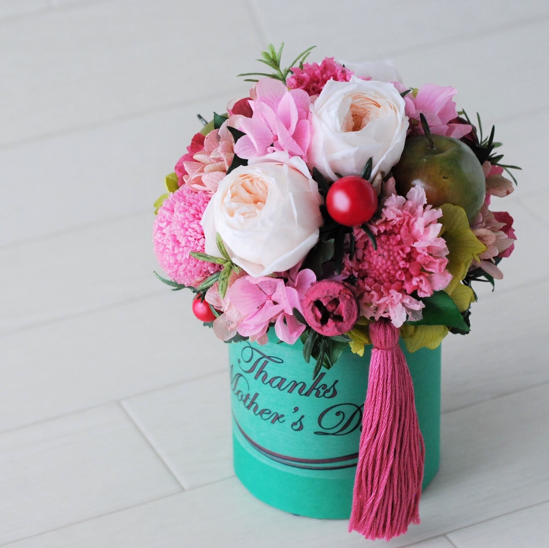 材質:プリザーブドフラワー(バラ、アジサイ、スカビオサ、ピンポンマム、木の実、ヘデラリーフ)、青リンゴと葉物は一部アーティフシャル(良質の造花)を使用しています。器はボール紙でおつくりしています。